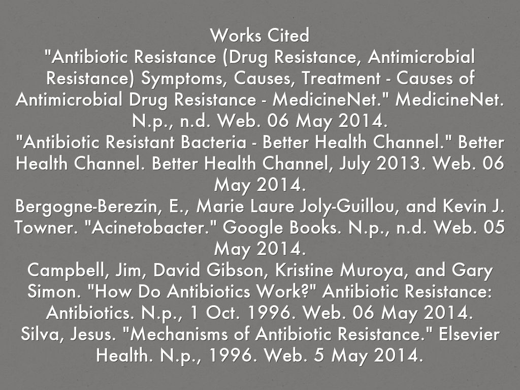 "Antibiotic Resistance (Drug Resistance, Antimicrobial Resistance) Symptoms, Causes, Treatment - Causes of Antimicrobial Drug Resistance - MedicineNet." MedicineNet. N.p., n.d. Web. 06 May 2014.