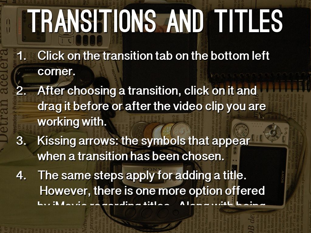 The same steps apply for adding a title. However, there is one more option offered by iMovie regarding titles. Along with being able to drag titles before and after videos, titles can also be dragged above videos in order for the text to appear on the actual video itself.