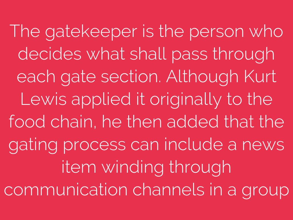 The gatekeeper is the person who decides what shall pass through each gate section. Although Kurt Lewis applied it originally to the food chain, he then added that the gating process can include a news item winding through communication channels in a group