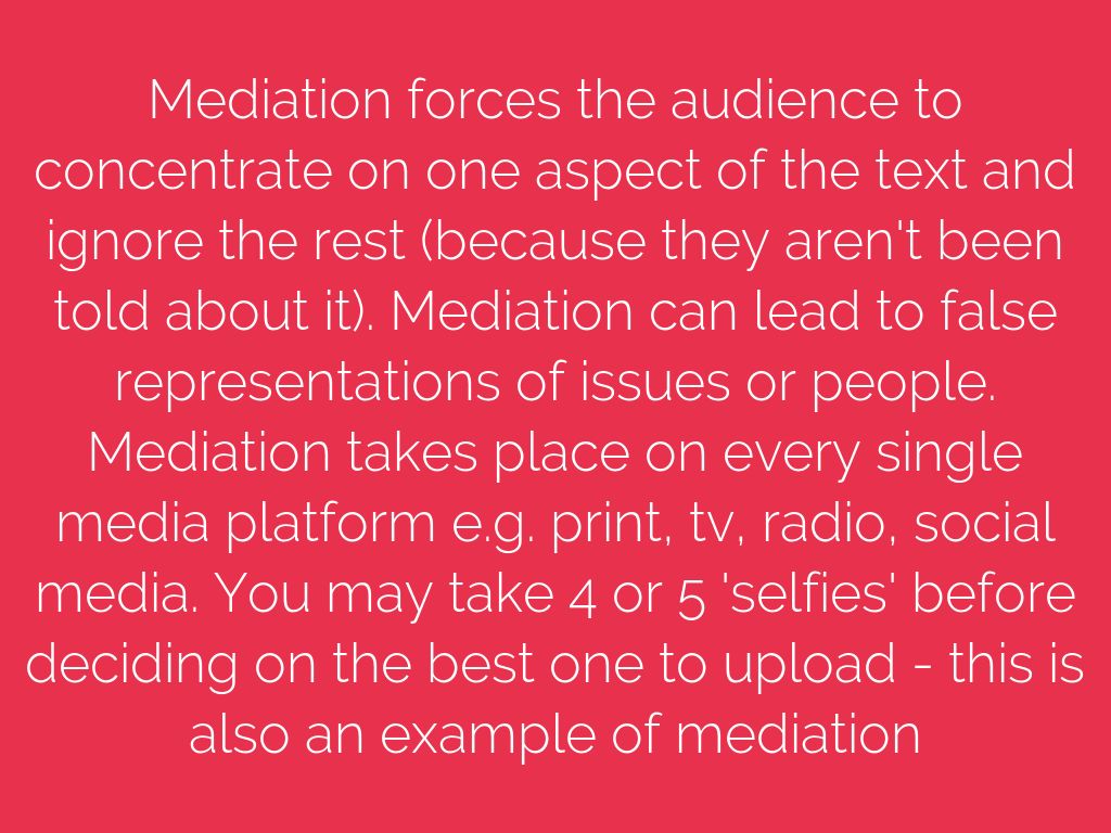 Mediation forces the audience to concentrate on one aspect of the text and ignore the rest (because they aren't been told about it). Mediation can lead to false representations of issues or people. Mediation takes place on every single media platform e.g. print, tv, radio, social media. You may take 4 or 5 'selfies' before deciding on the best one to upload - this is also an example of mediation