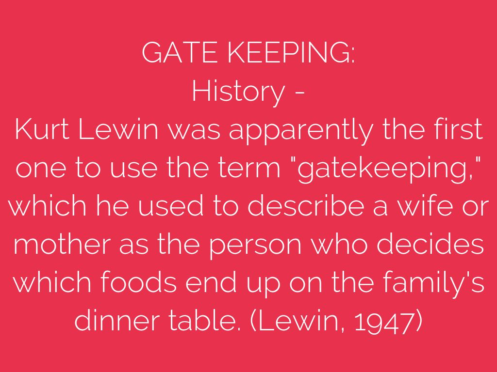 Kurt Lewin was apparently the first one to use the term "gatekeeping," which he used to describe a wife or mother as the person who decides which foods end up on the family's dinner table. (Lewin, 1947)