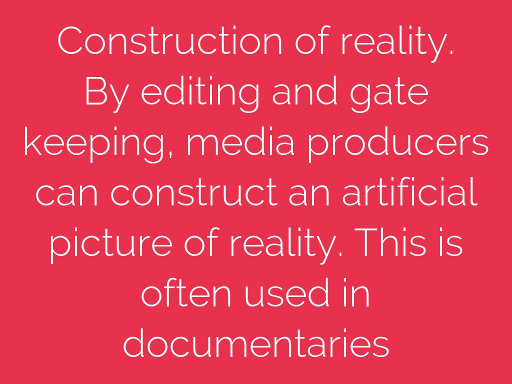 By editing and gate keeping, media producers can construct an artificial picture of reality. This is often used in documentaries