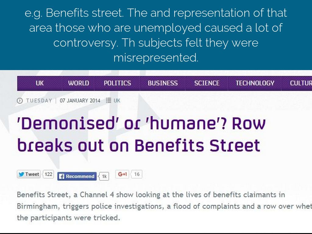 e.g. Benefits street. The and representation of that area those who are unemployed caused a lot of controversy. Th subjects felt they were misrepresented.