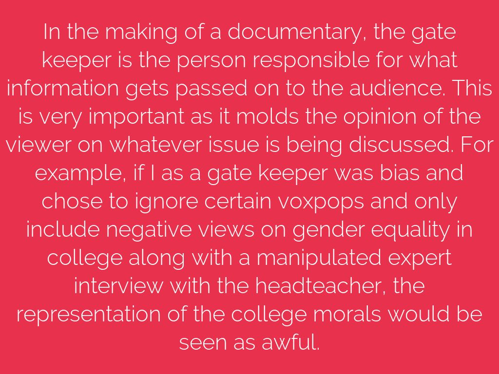 In the making of a documentary, the gate keeper is the person responsible for what information gets passed on to the audience. This is very important as it molds the opinion of the viewer on whatever issue is being discussed. For example, if I as a gate keeper was bias and chose to ignore certain voxpops and only include negative views on gender equality in college along with a manipulated expert interview with the headteacher, the representation of the college morals would be seen as awful.