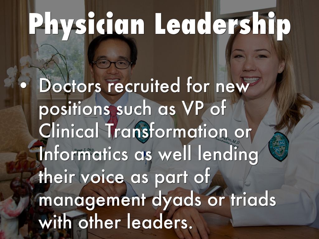 • Doctors recruited for new positions such as VP of Clinical Transformation or Informatics as well lending their voice as part of management dyads or triads with other leaders.