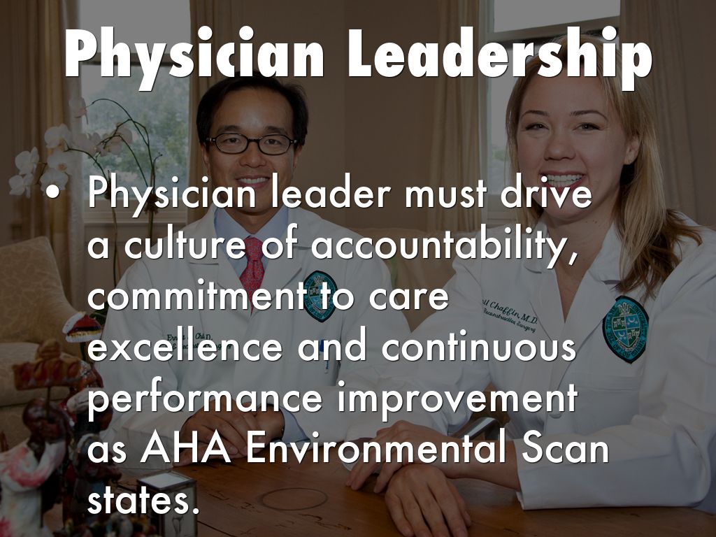 • Physician leader must drive a culture of accountability, commitment to care excellence and continuous performance improvement as AHA Environmental Scan states.