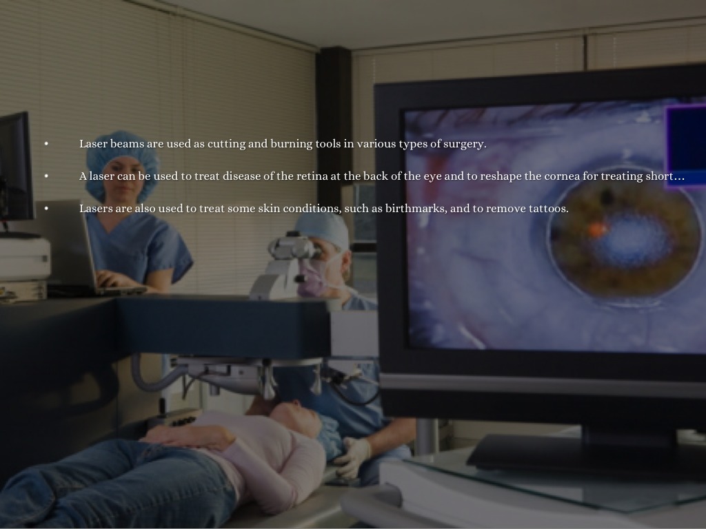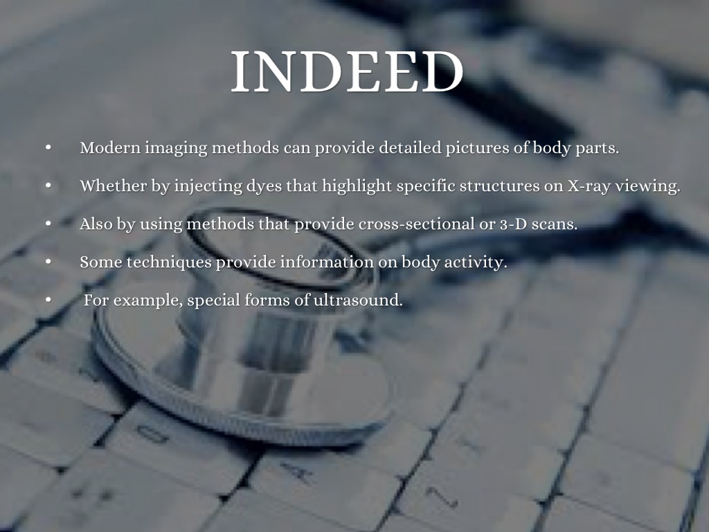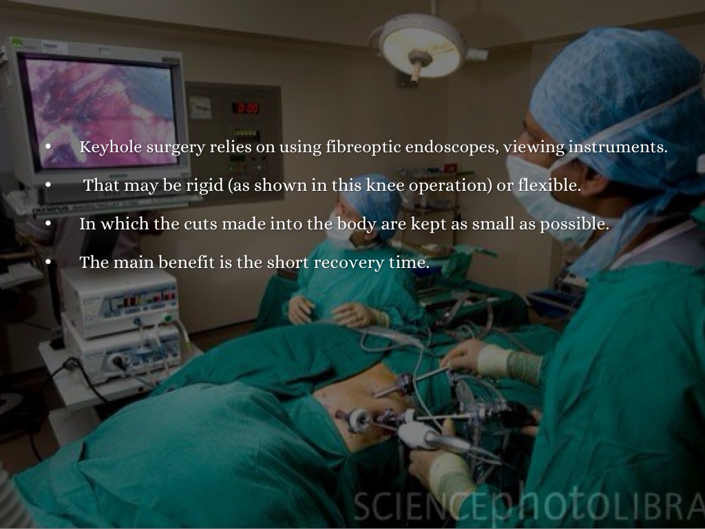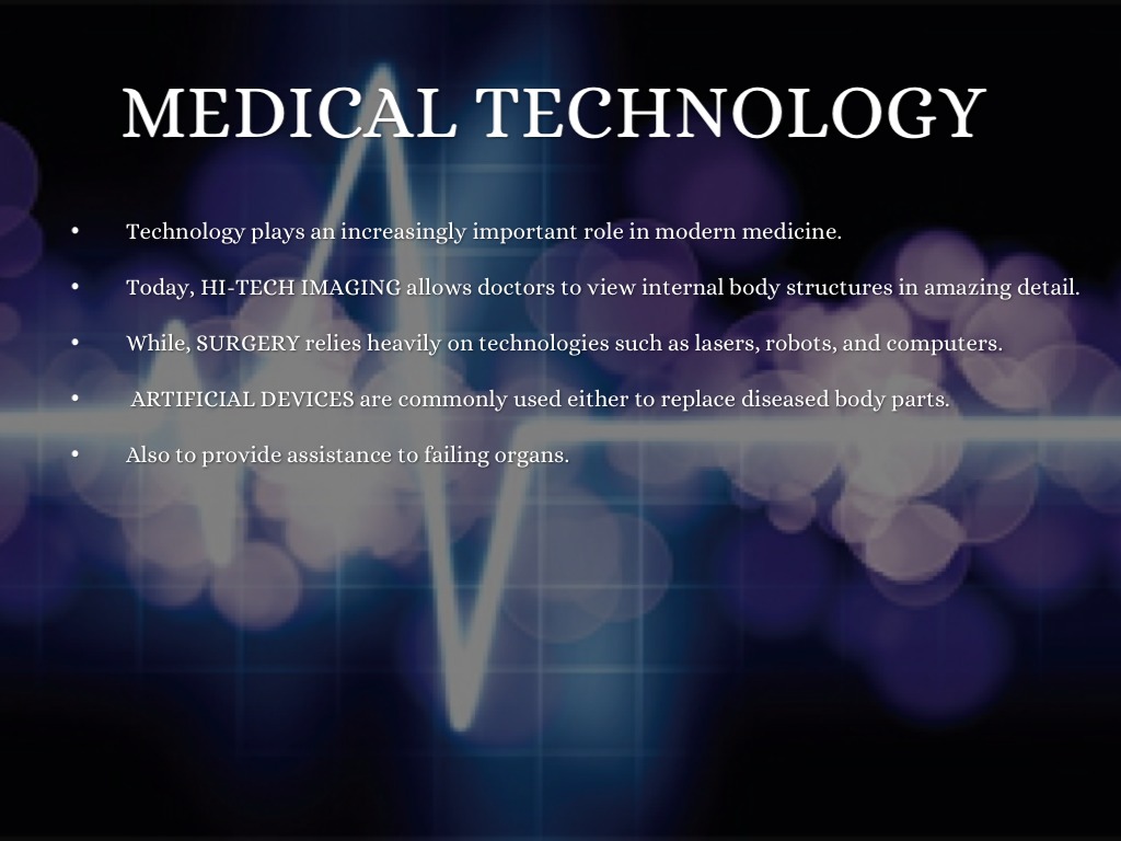 Technology plays an increasingly important role in modern medicine. Today, HI-TECH IMAGING allows doctors to view internal body structures in amazing detail, while, SURGERY relies heavily on technologies such as lasers, robots, and computers. ARTIFICIAL DEVICES are commonly used either to replace diseased body parts completely, or to provide assistance to failing organs.