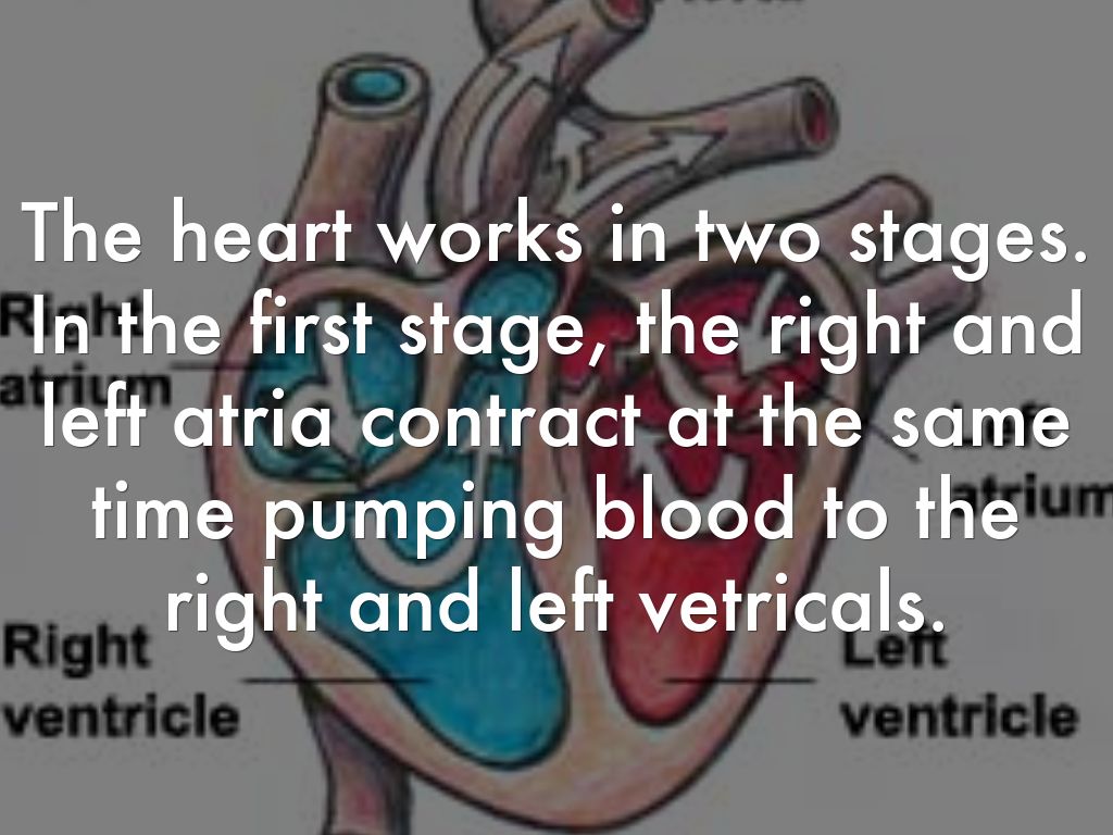 The heart works in two stages. In the first stage, the right and left atria contract at the same time pumping blood to the right and left vetricals.
