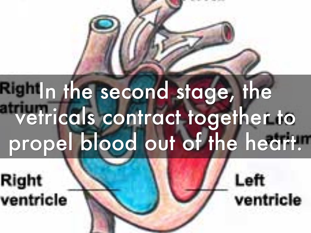In the second stage, the vetricals contract together to propel blood out of the heart.