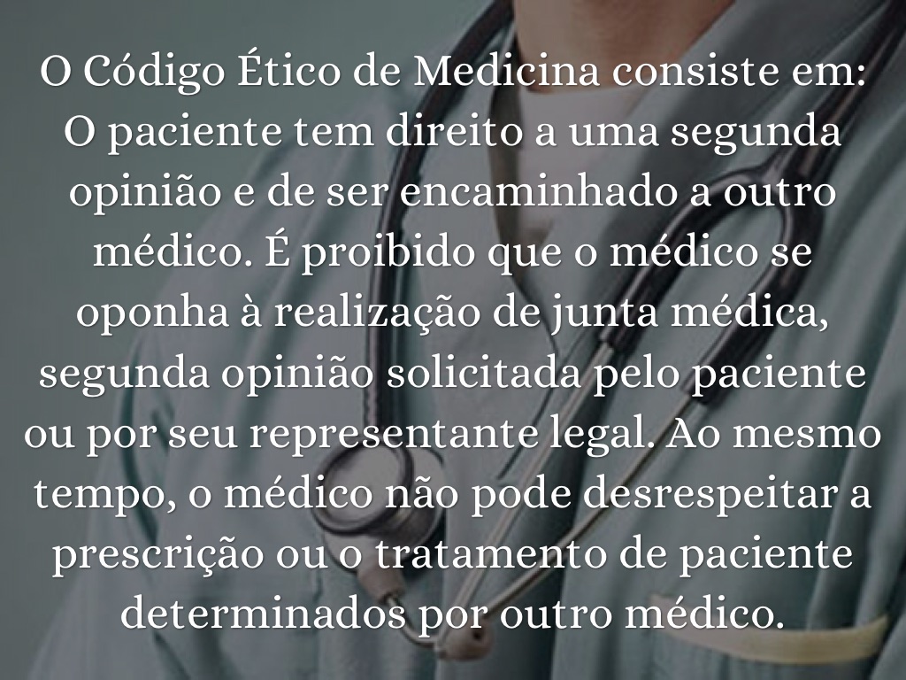 O Código Ético de Medicina consiste em: O paciente tem direito a uma segunda opinião e de ser encaminhado a outro médico. É proibido que o médico se oponha à realização de junta médica, segunda opinião solicitada pelo paciente ou por seu representante legal. Ao mesmo tempo, o médico não pode desrespeitar a prescrição ou o tratamento de paciente determinados por outro médico.