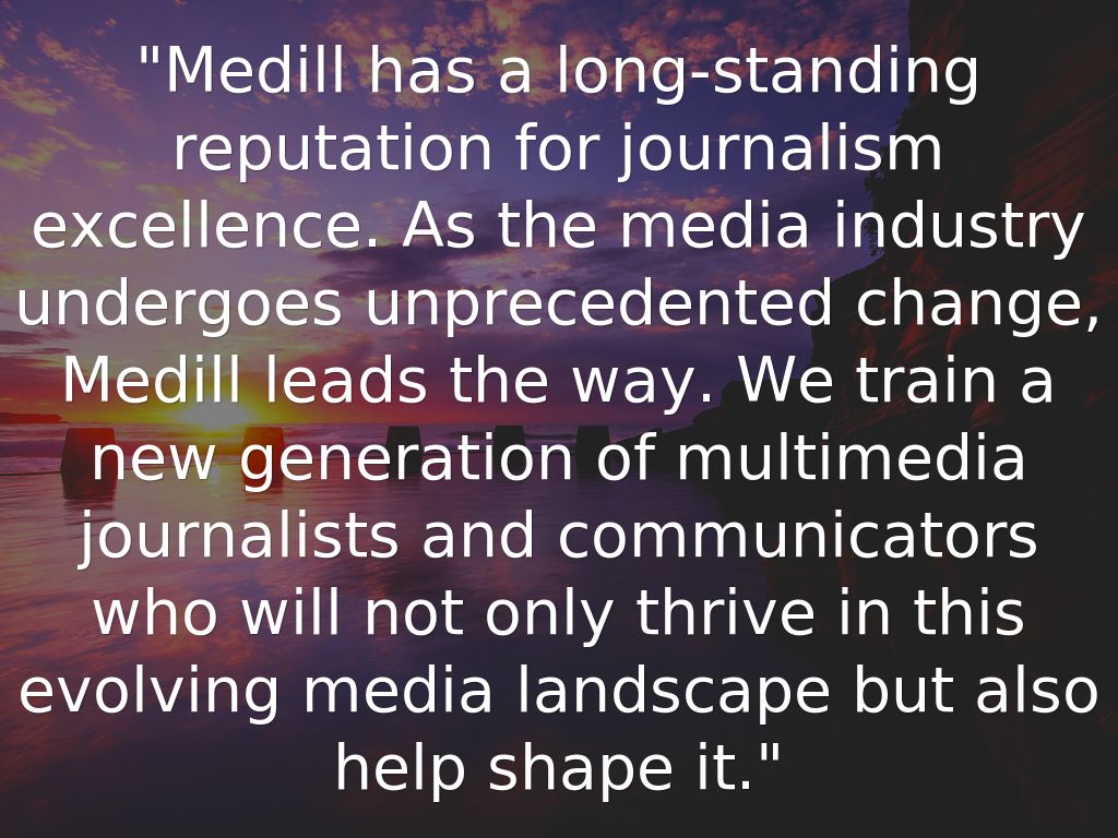 "Medill has a long-standing reputation for journalism excellence. As the media industry undergoes unprecedented change, Medill leads the way. We train a new generation of multimedia journalists and communicators who will not only thrive in this evolving media landscape but also help shape it."