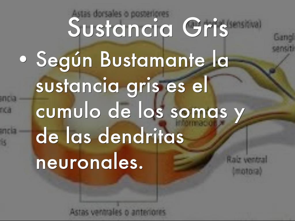 - Según Bustamante la sustancia gris es el cumulo de los somas y de las dendritas neuronales.