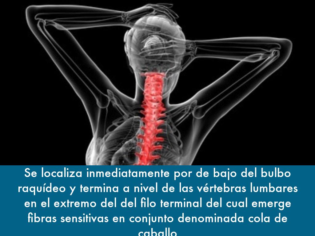 Se localiza inmediatamente por de bajo del bulbo raquídeo y termina a nivel de las vértebras lumbares en el extremo del del filo terminal del cual emerge fibras sensitivas en conjunto denominada cola de caballo