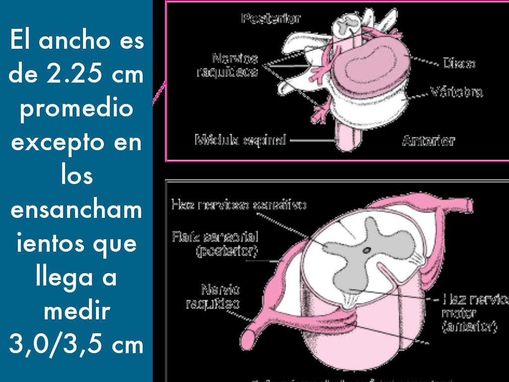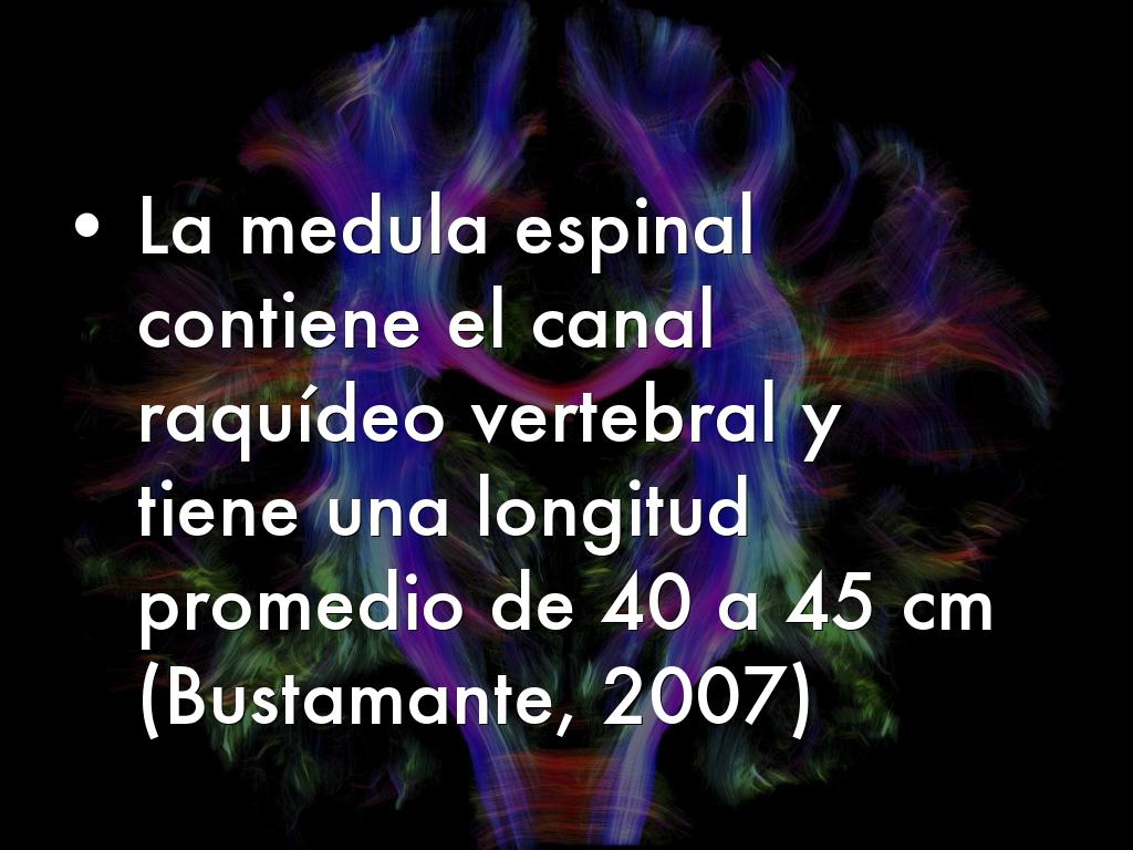 - La medula espinal contiene el canal raquídeo vertebral y tiene una longitud promedio de 40 a 45 cm (Bustamante, 2007)