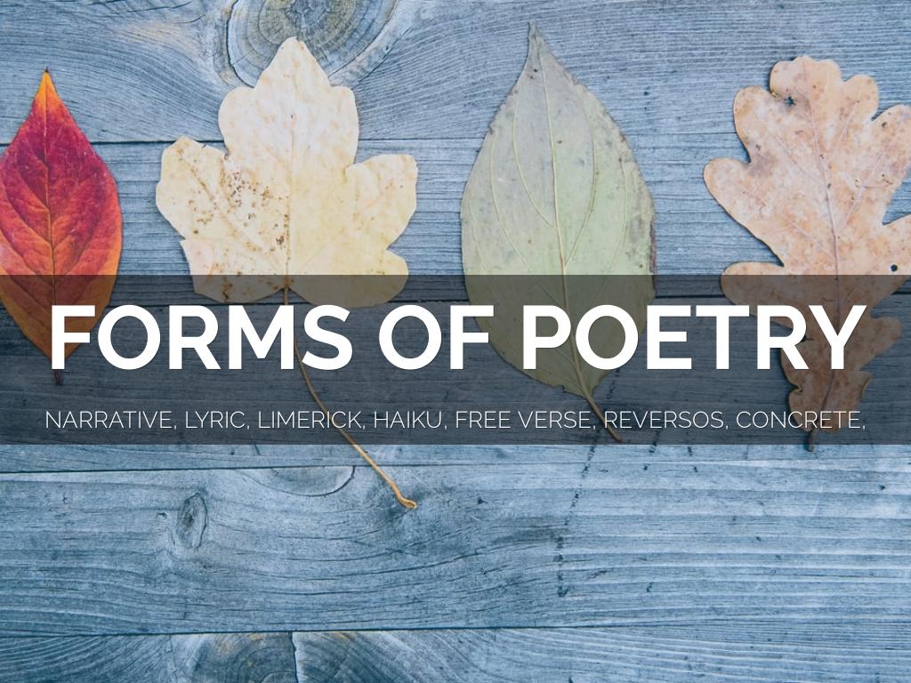 NARRATIVE, LYRIC, LIMERICK, HAIKU, FREE VERSE, REVERSOS, CONCRETE,