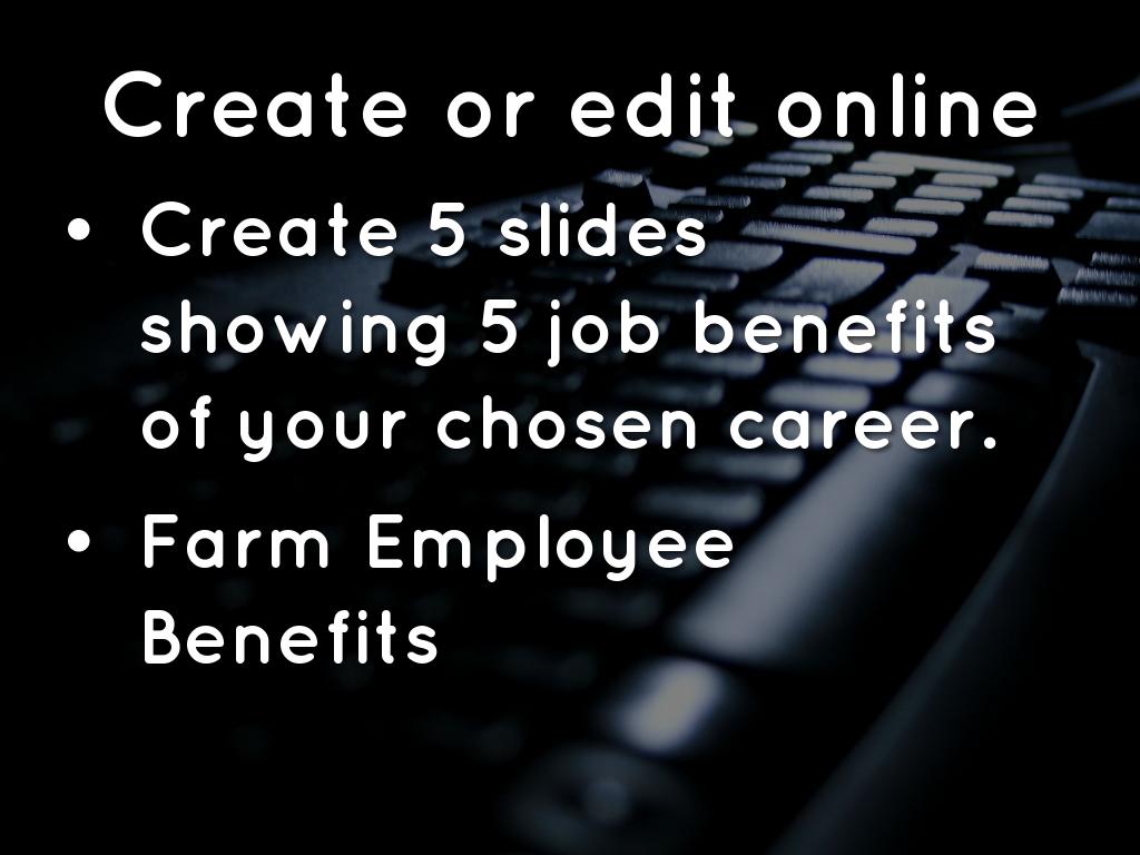 Create 5 slides showing 5 job benefits of your chosen career.