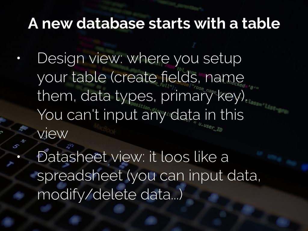 Design view: where you setup your table (create fields, name them, data types, primary key). You can't input any data in this view