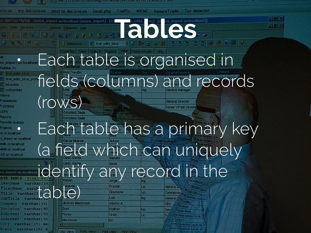 Each table has a primary key (a field which can uniquely identify any record in the table)