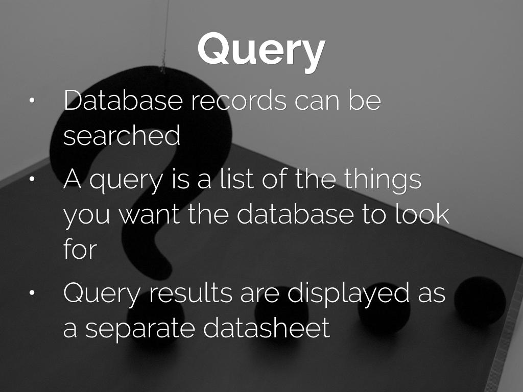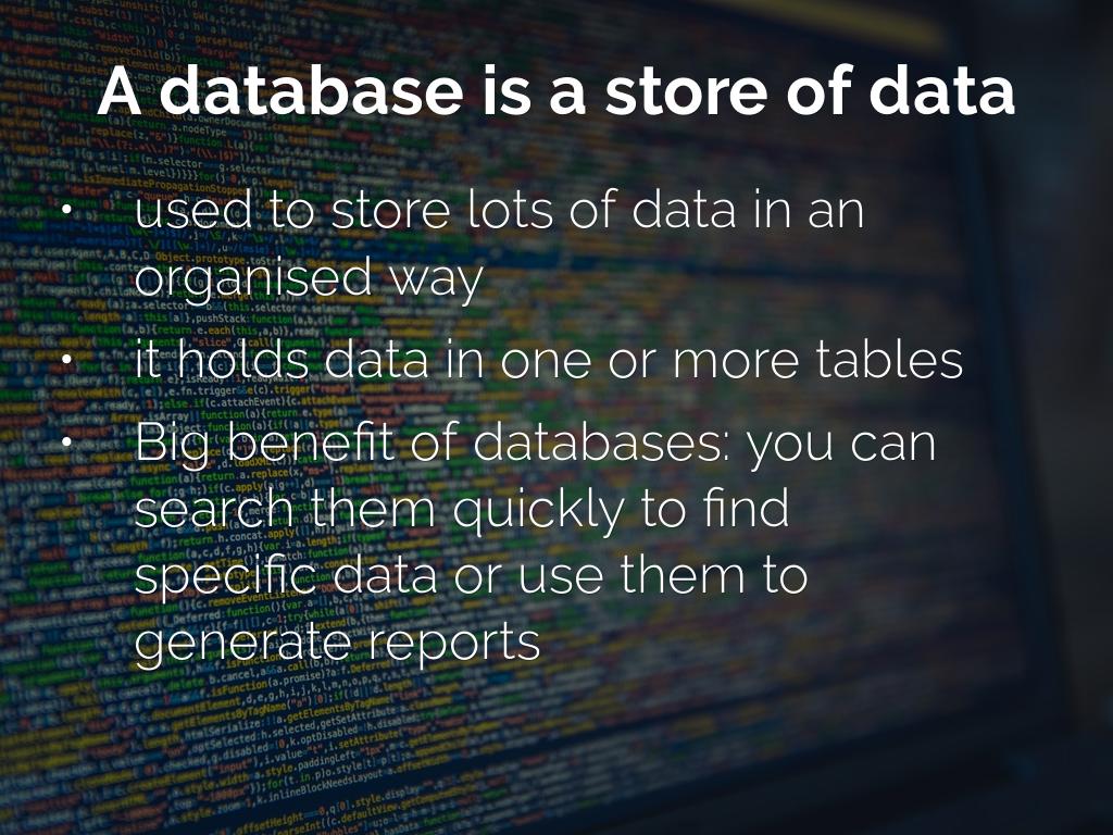 Big benefit of databases: you can search them quickly to find specific data or use them to generate reports