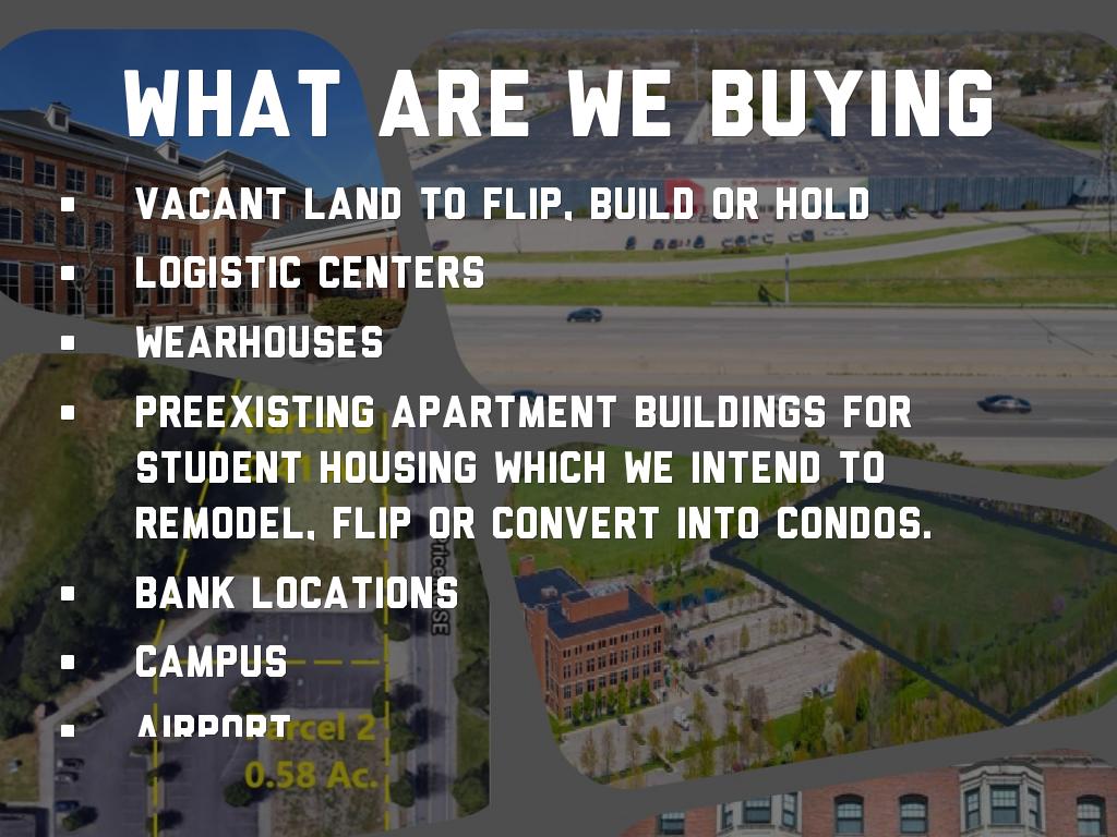 Preexisting Apartment Buildings for student housing which we intend to remodel, flip or convert into Condos.