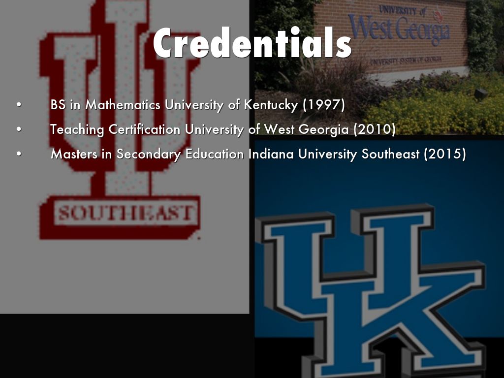 - Masters in Secondary Education Indiana University Southeast (2015)