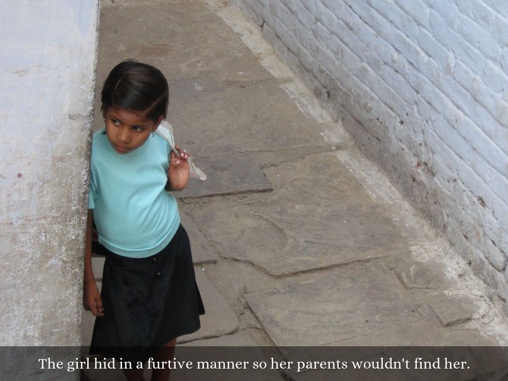 The girl hid in a furtive manner so her parents wouldn't find her.