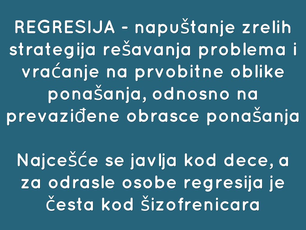 REGRESIJA - napuštanje zrelih strategija rešavanja problema i vraćanje na prvobitne oblike ponašanja, odnosno na prevaziđene obrasce ponašanja