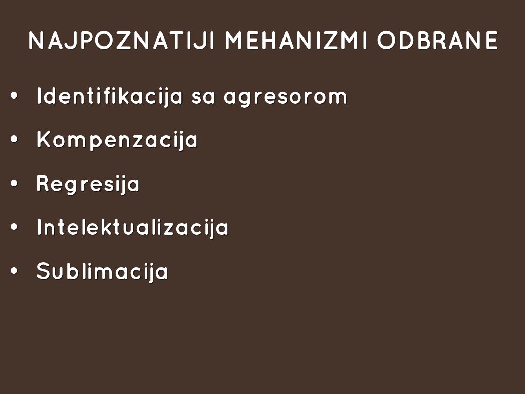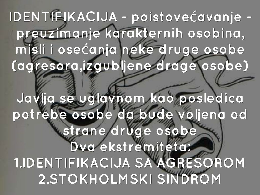 IDENTIFIKACIJA - poistovećavanje - preuzimanje karakternih osobina, misli i osećanja neke druge osobe (agresora,izgubljene drage osobe)