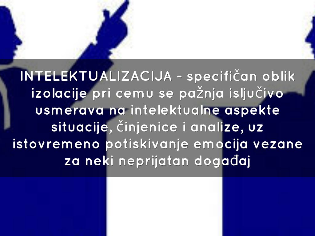 INTELEKTUALIZACIJA - specifičan oblik izolacije pri cemu se pažnja isljučivo usmerava na intelektualne aspekte situacije, činjenice i analize, uz istovremeno potiskivanje emocija vezane za neki neprijatan događaj
