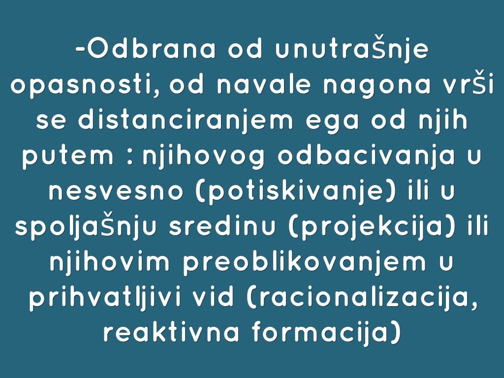 -Odbrana od unutrašnje opasnosti, od navale nagona vrši se distanciranjem ega od njih putem : njihovog odbacivanja u nesvesno (potiskivanje) ili u spoljašnju sredinu (projekcija) ili njihovim preoblikovanjem u prihvatljivi vid (racionalizacija, reaktivna formacija)