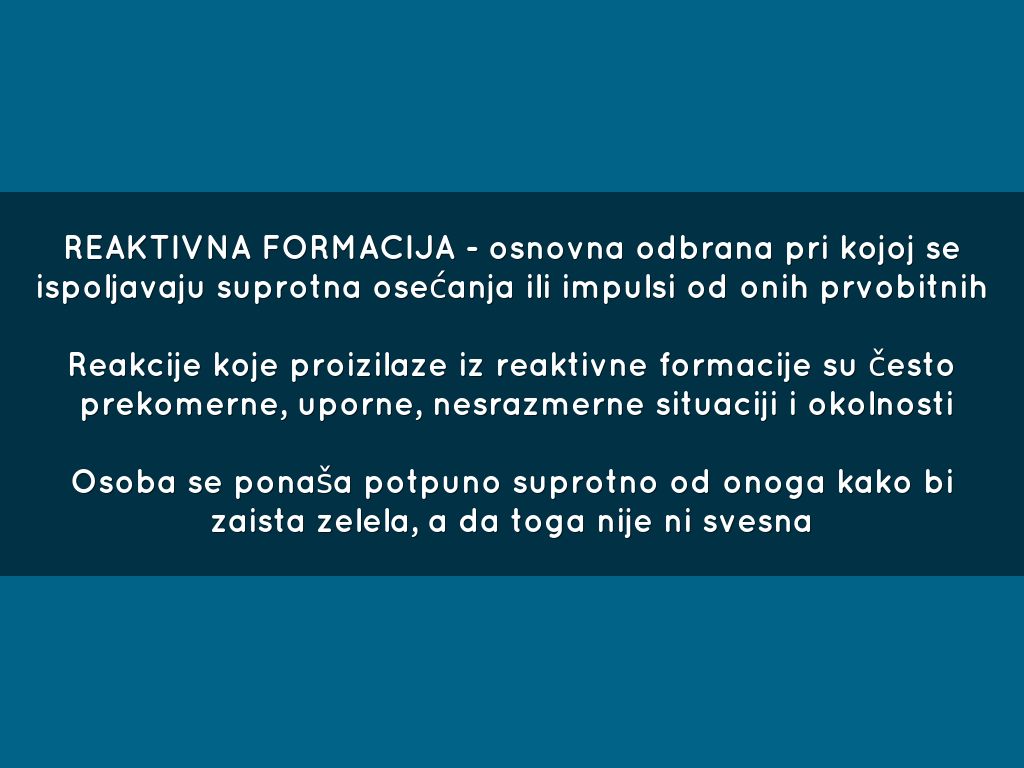 REAKTIVNA FORMACIJA - osnovna odbrana pri kojoj se ispoljavaju suprotna osećanja ili impulsi od onih prvobitnih