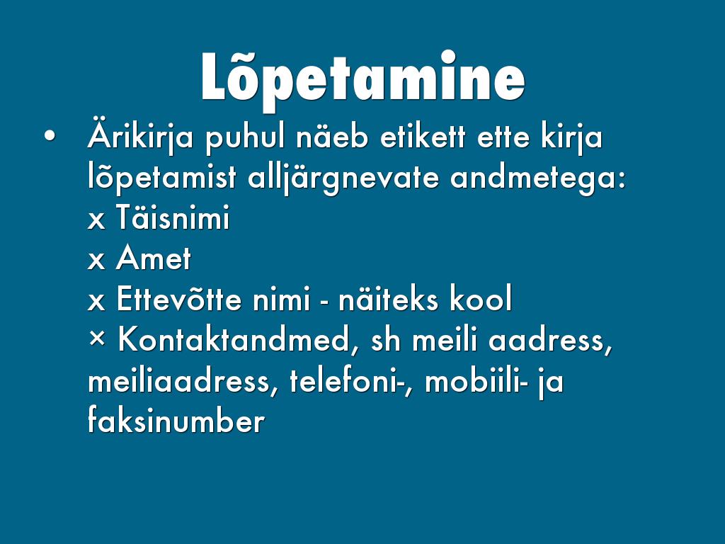 Ärikirja puhul näeb etikett ette kirja lõpetamist alljärgnevate andmetega: x Täisnimi x Amet x Ettevõtte nimi - näiteks kool × Kontaktandmed, sh meili aadress, meiliaadress, telefoni-, mobiili- ja faksinumber