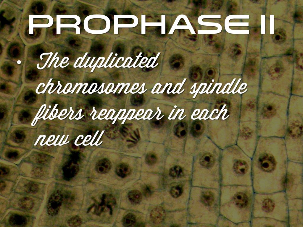 The duplicated chromosomes and spindle fibers reappear in each new cell
