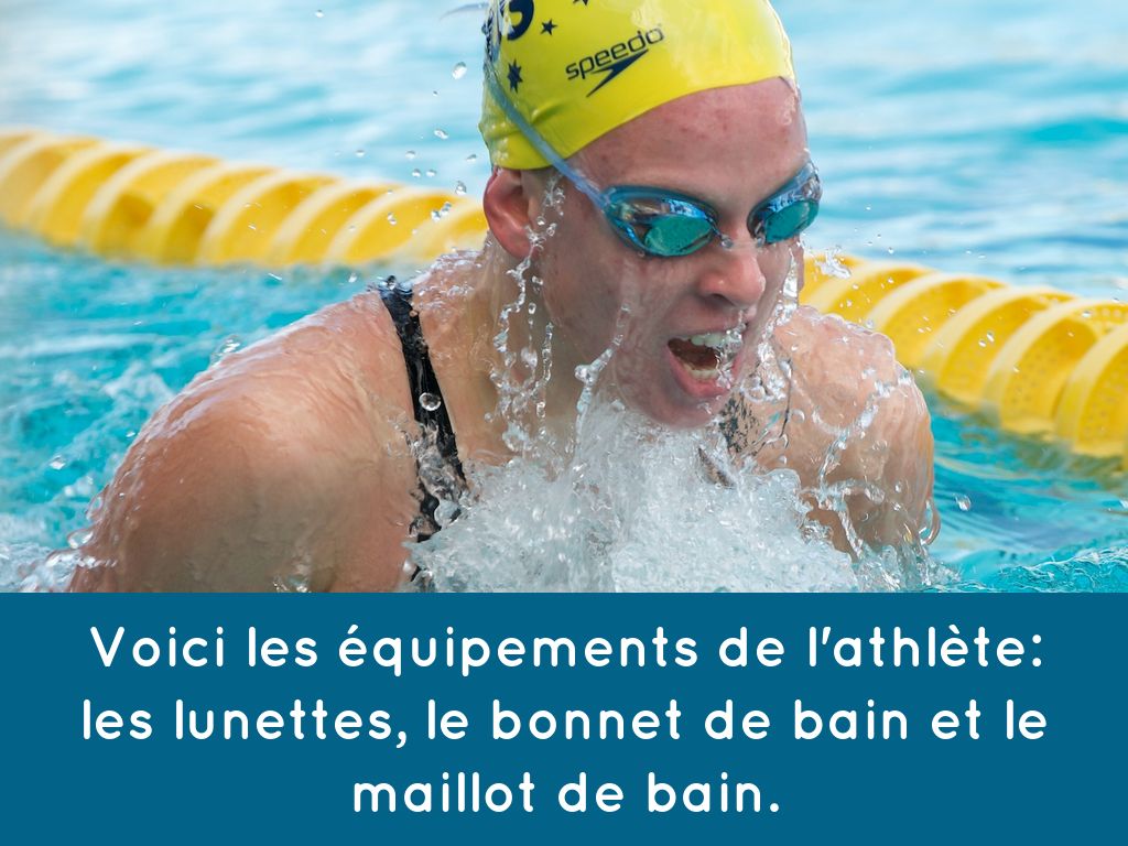 Voici les équipements de l'athlète: les lunettes, le bonnet de bain et le maillot de bain.