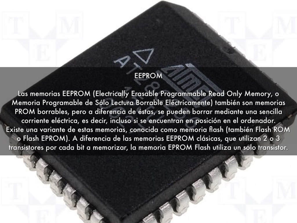 Las memorias EEPROM (Electrically Erasable Programmable Read Only Memory, o Memoria Programable de Sólo Lectura Borrable Eléctricamente) también son memorias PROM borrables, pero a diferencia de éstas, se pueden borrar mediante una sencilla corriente eléctrica, es decir, incluso si se encuentran en posición en el ordenador.