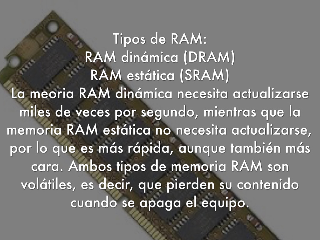 La meoria RAM dinámica necesita actualizarse miles de veces por segundo, mientras que la memoria RAM estática no necesita actualizarse, por lo que es más rápida, aunque también más cara. Ambos tipos de memoria RAM son volátiles, es decir, que pierden su contenido cuando se apaga el equipo.