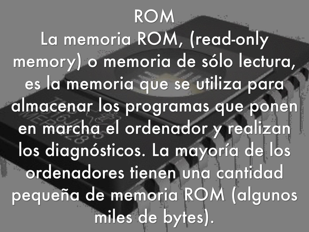 La memoria ROM, (read-only memory) o memoria de sólo lectura, es la memoria que se utiliza para almacenar los programas que ponen en marcha el ordenador y realizan los diagnósticos. La mayoría de los ordenadores tienen una cantidad pequeña de memoria ROM (algunos miles de bytes).