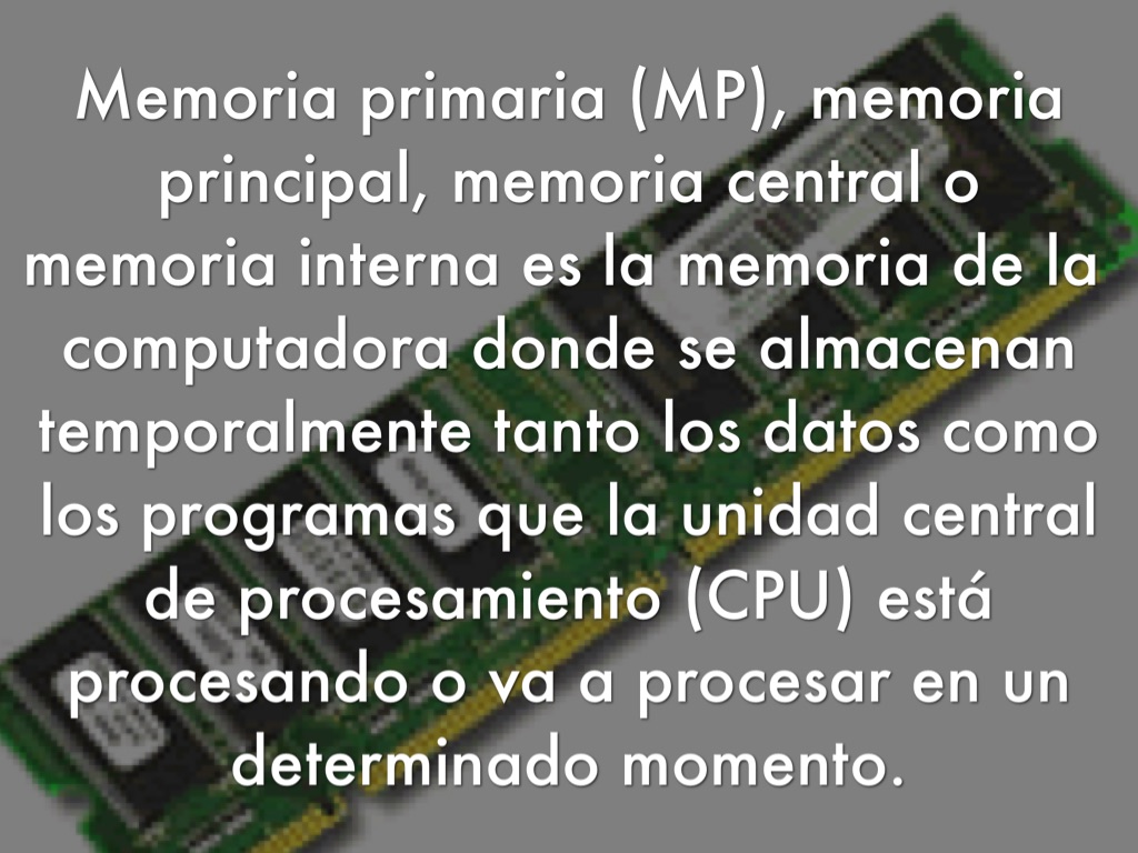 Memoria primaria (MP), memoria principal, memoria central o memoria interna es la memoria de la computadora donde se almacenan temporalmente tanto los datos como los programas que la unidad central de procesamiento (CPU) está procesando o va a procesar en un determinado momento.