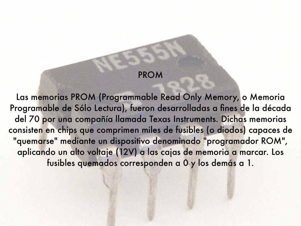 Las memorias PROM (Programmable Read Only Memory, o Memoria Programable de Sólo Lectura), fueron desarrolladas a fines de la década del 70 por una compañía llamada Texas Instruments. Dichas memorias consisten en chips que comprimen miles de fusibles (o diodos) capaces de "quemarse" mediante un dispositivo denominado "programador ROM", aplicando un alto voltaje (12V) a las cajas de memoria a marcar. Los fusibles quemados corresponden a 0 y los demás a 1.