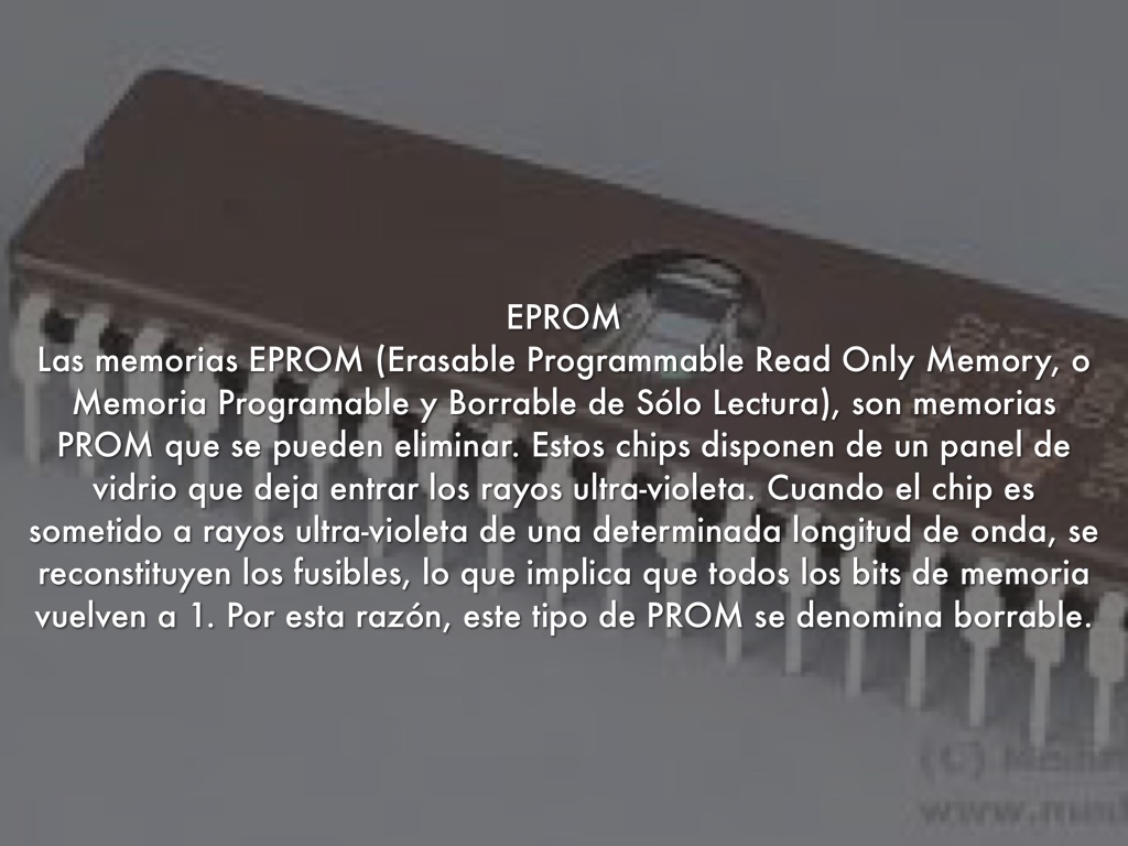 Las memorias EPROM (Erasable Programmable Read Only Memory, o Memoria Programable y Borrable de Sólo Lectura), son memorias PROM que se pueden eliminar. Estos chips disponen de un panel de vidrio que deja entrar los rayos ultra-violeta. Cuando el chip es sometido a rayos ultra-violeta de una determinada longitud de onda, se reconstituyen los fusibles, lo que implica que todos los bits de memoria vuelven a 1. Por esta razón, este tipo de PROM se denomina borrable.