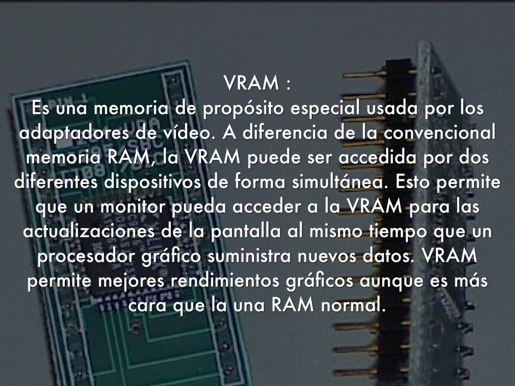 Es una memoria de propósito especial usada por los adaptadores de vídeo. A diferencia de la convencional memoria RAM, la VRAM puede ser accedida por dos diferentes dispositivos de forma simultánea. Esto permite que un monitor pueda acceder a la VRAM para las actualizaciones de la pantalla al mismo tiempo que un procesador gráfico suministra nuevos datos. VRAM permite mejores rendimientos gráficos aunque es más cara que la una RAM normal.