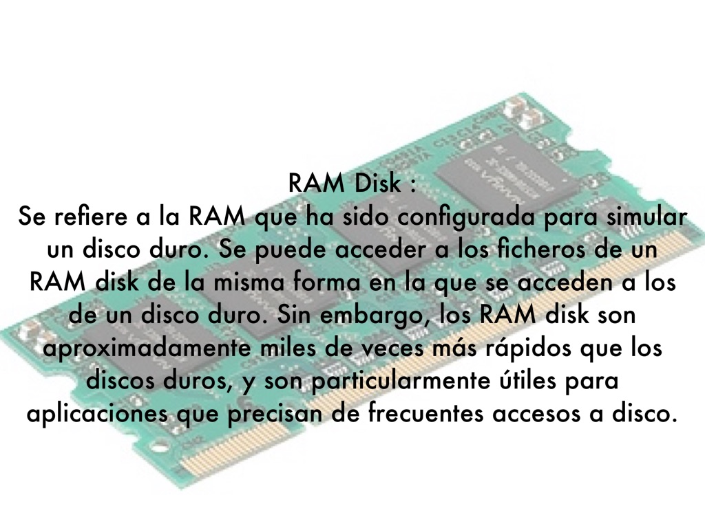 Se refiere a la RAM que ha sido configurada para simular un disco duro. Se puede acceder a los ficheros de un RAM disk de la misma forma en la que se acceden a los de un disco duro. Sin embargo, los RAM disk son aproximadamente miles de veces más rápidos que los discos duros, y son particularmente útiles para aplicaciones que precisan de frecuentes accesos a disco.