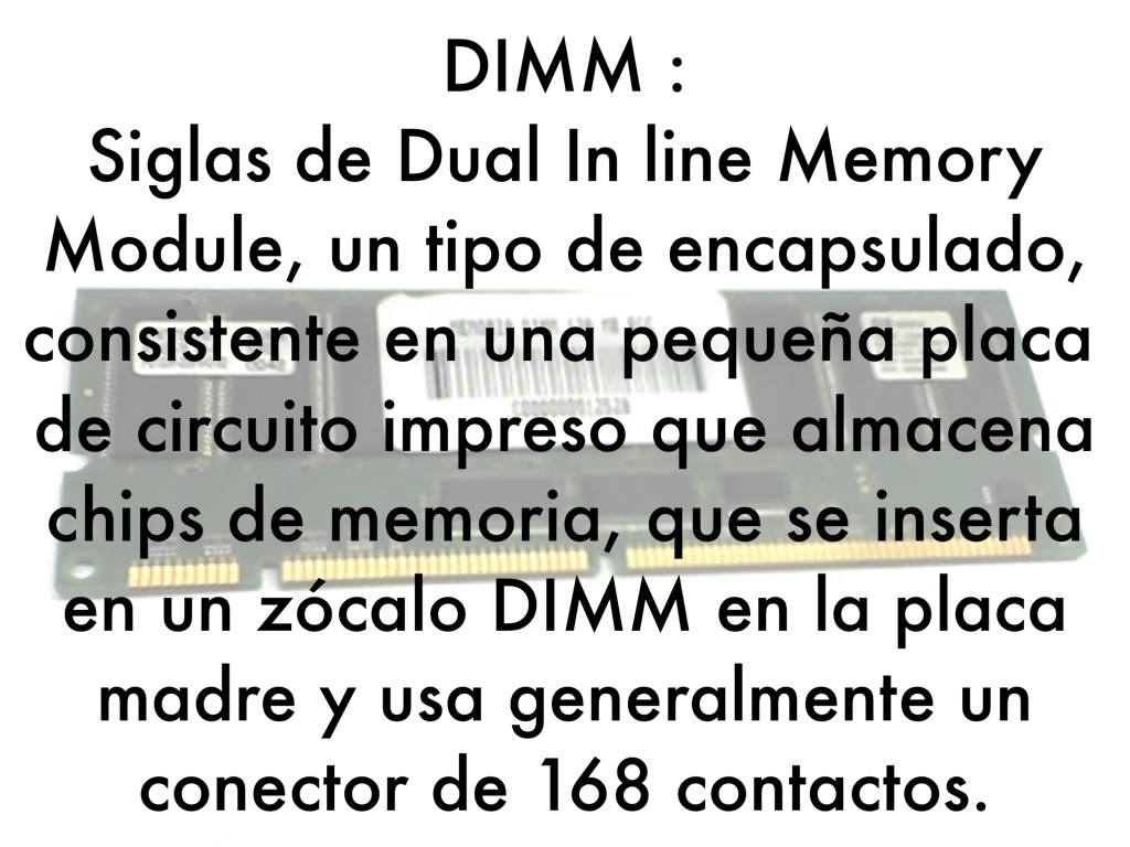 Siglas de Dual In line Memory Module, un tipo de encapsulado, consistente en una pequeña placa de circuito impreso que almacena chips de memoria, que se inserta en un zócalo DIMM en la placa madre y usa generalmente un conector de 168 contactos.