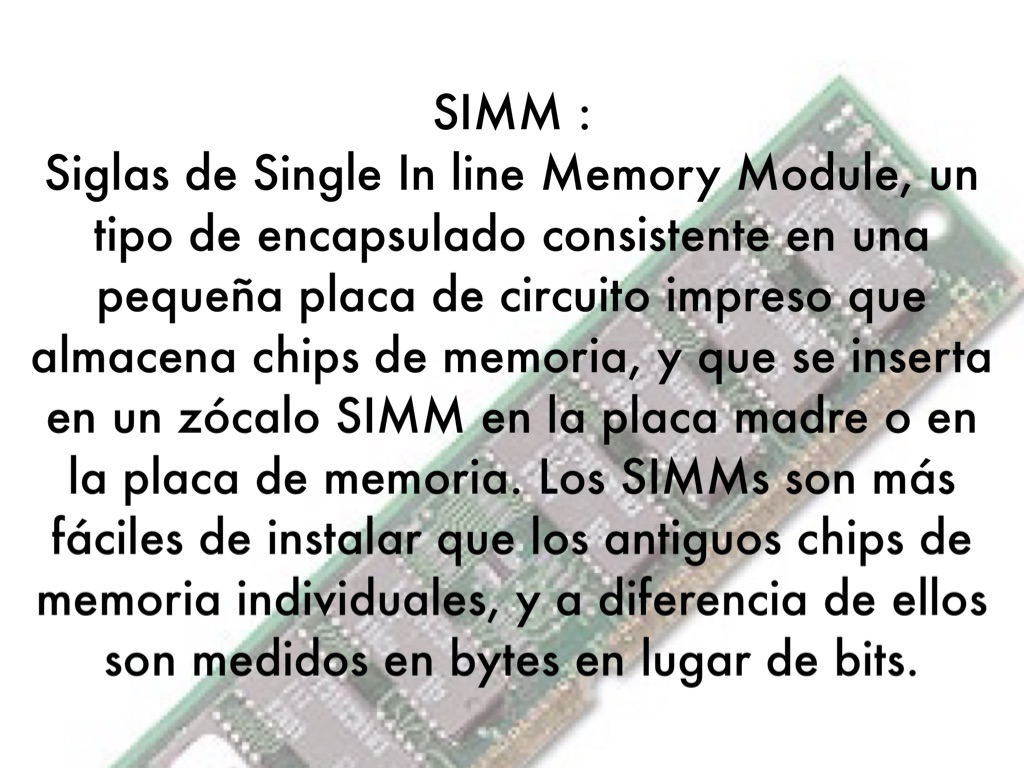 Siglas de Single In line Memory Module, un tipo de encapsulado consistente en una pequeña placa de circuito impreso que almacena chips de memoria, y que se inserta en un zócalo SIMM en la placa madre o en la placa de memoria. Los SIMMs son más fáciles de instalar que los antiguos chips de memoria individuales, y a diferencia de ellos son medidos en bytes en lugar de bits.