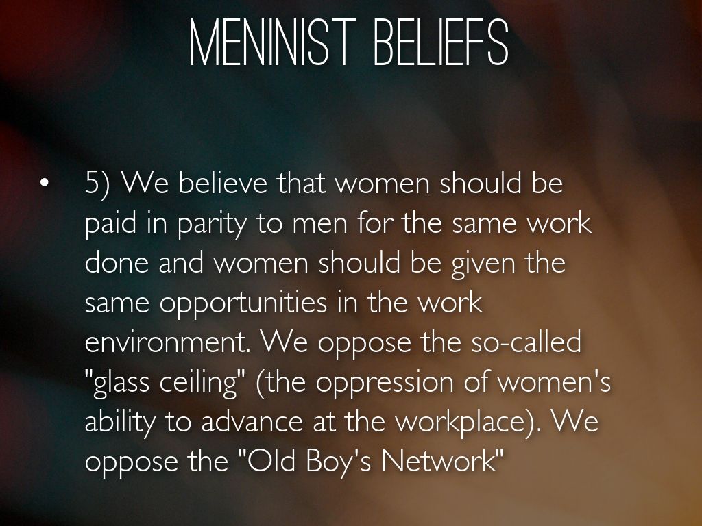 5) We believe that women should be paid in parity to men for the same work done and women should be given the same opportunities in the work environment. We oppose the so-called "glass ceiling" (the oppression of women's ability to advance at the workplace). We oppose the "Old Boy's Network"