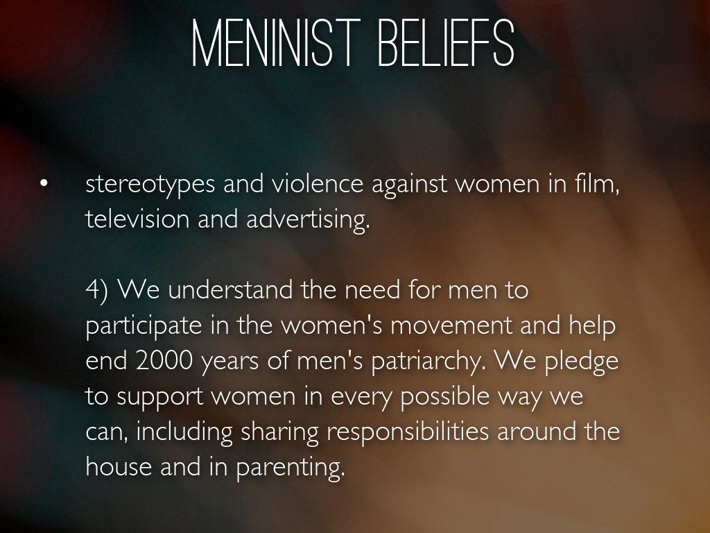 4) We understand the need for men to participate in the women's movement and help end 2000 years of men's patriarchy. We pledge to support women in every possible way we can, including sharing responsibilities around the house and in parenting.