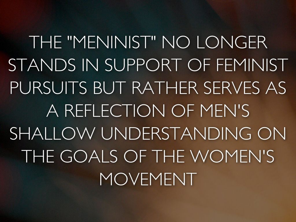THE "MENINIST" NO LONGER STANDS IN SUPPORT OF FEMINIST PURSUITS BUT RATHER SERVES AS A REFLECTION OF MEN'S SHALLOW UNDERSTANDING ON THE GOALS OF THE WOMEN'S MOVEMENT