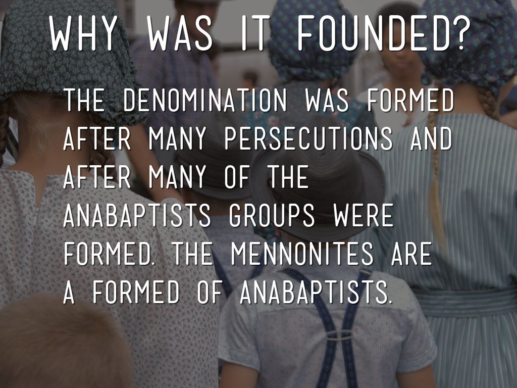 The denomination was formed after many persecutions and after many of the Anabaptists groups were formed. The Mennonites are a formed of Anabaptists.