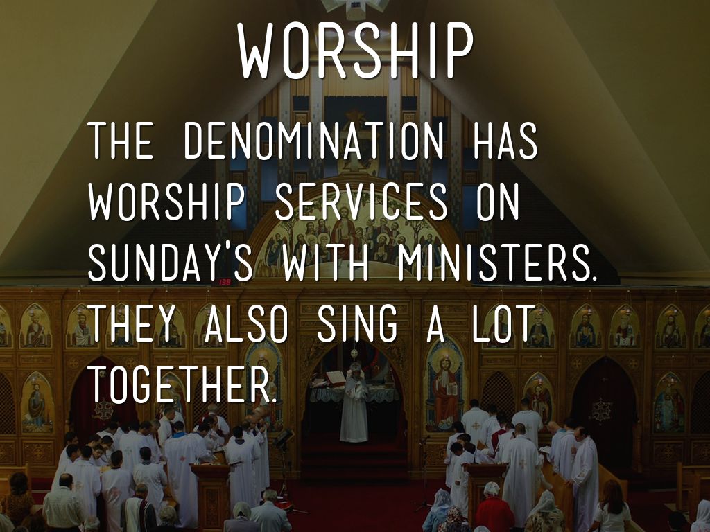 The denomination has worship services on Sunday's with ministers. They also sing a lot together.
