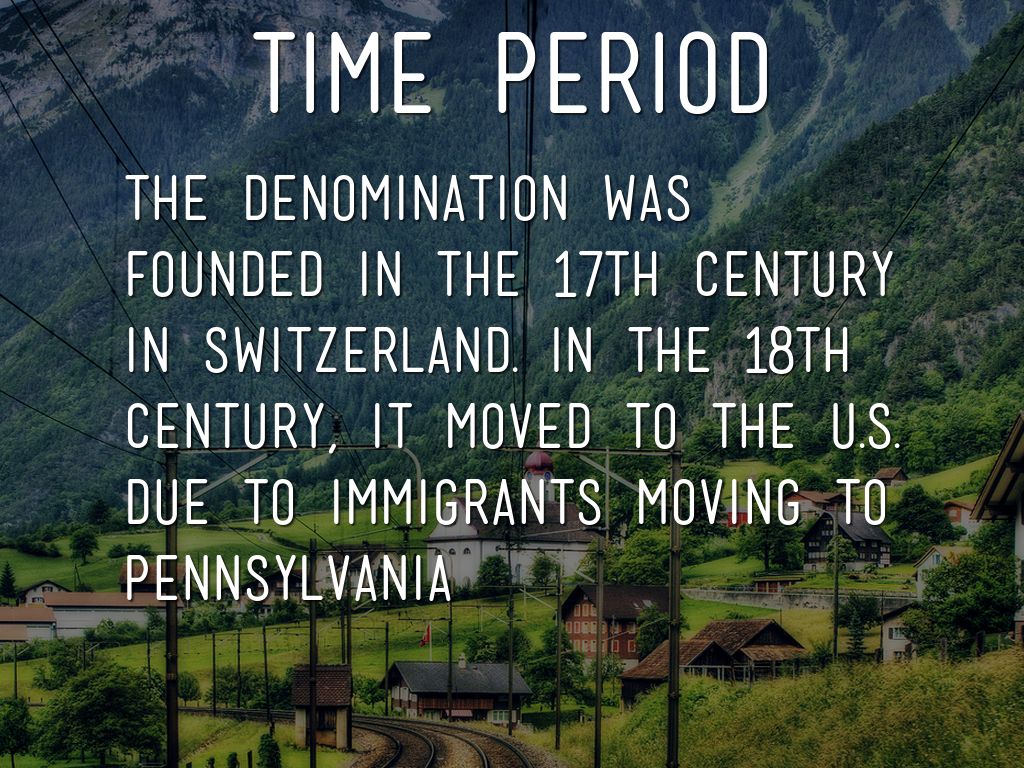 The denomination was founded in the 17th century in Switzerland. In the 18th century, it moved to the U.S. due to immigrants moving to Pennsylvania